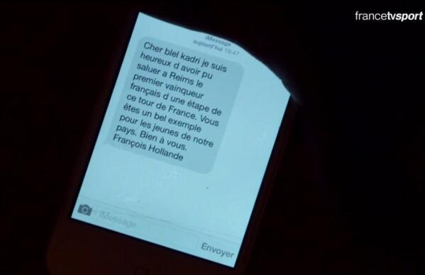 Президент Франции Франсуа Олланд поздравляет велогонщика Блела Кадри с победой на этапе "Тур де Франс" по СМС