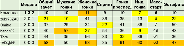 4. odekolon (GER) 277 (7) (france,1-50) (norway,3-43) (germany,5-39) (sweden,4-41) (switzerland,2-36) (austria,8-36) (ukraine,7-32) Индивидуальный зачет = 65;
